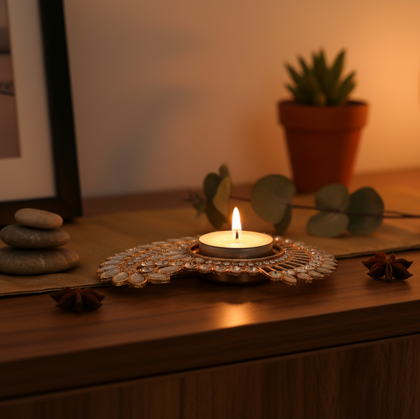 Kundan Work Tea Light Holder Decorative Indian Metal Diya for Festivals & Home Décor