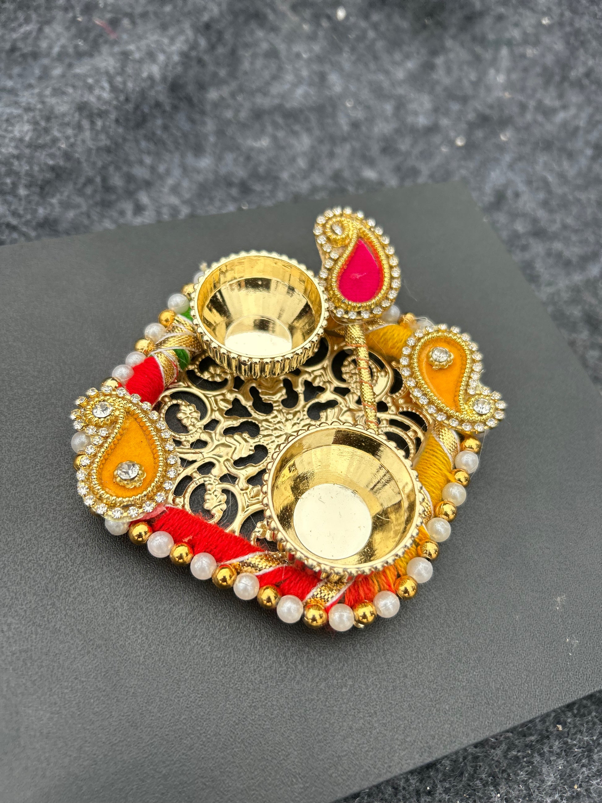 Traditional Wooden Thali Set – Hand-painted multicolour Akshat Kumkum thali with tikka stick, ideal for daily rituals and festive ceremonies.